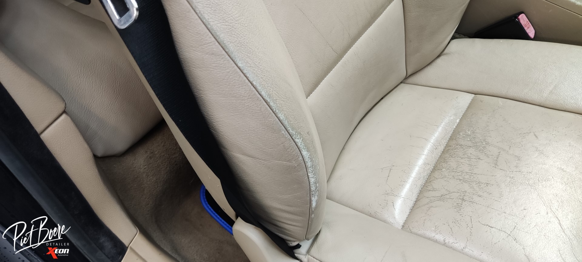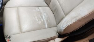 Nadat 20 jaar gelden (op dat moment) het leder geplaatst is in de BMW. Is het net wel aan herstel toe. De schade is groot zoals op foto’s te zien is. De schade van zeer aanvaardbaar tot 100% kunnen maken. De BMW kan er voorlopig weer een poosje tegen met goed onderhoud en verzorging.