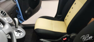 I.v.m. de verkoop van de Panda het interieur een reinigingsbeurt gegeven. De ruimte lag vol met hondenharen en ander vuil. Na stofzuigen de bekleding aangepakt. Met dit duotone zachtegele interieur moesten de vlekken er wel uitgehaald worden. Bekleding shampoorellen en drogen. Producten IGL Coatings gebruikt zoals een Dash, en Air.