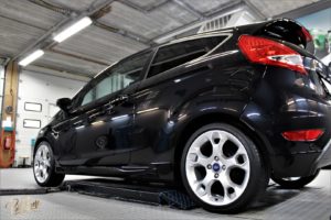 De Pantherblack kleurige Fiesta aangepakt op zijn krassen, hologrammen en swirls daarna voorzien van keramische coating. Het nodige polijstwerk ging vooraf. Inclusief handwas. Ook de velgen zijn in de coating gegaan. Stofzuigen en ramen lappen hoort er ook bij.