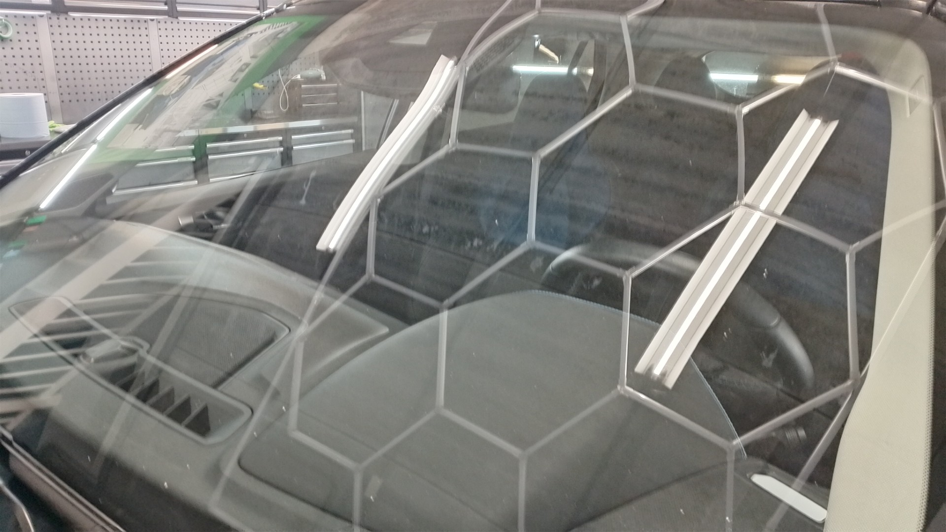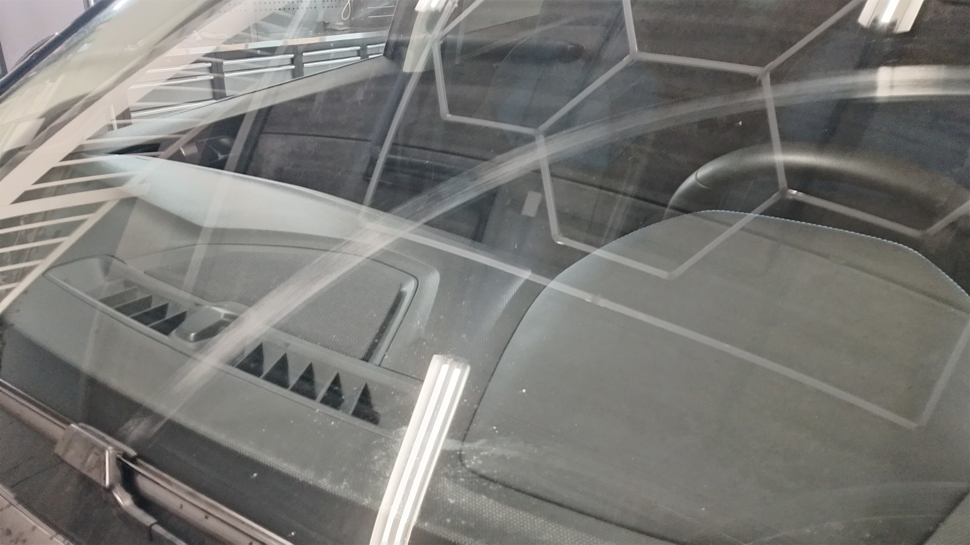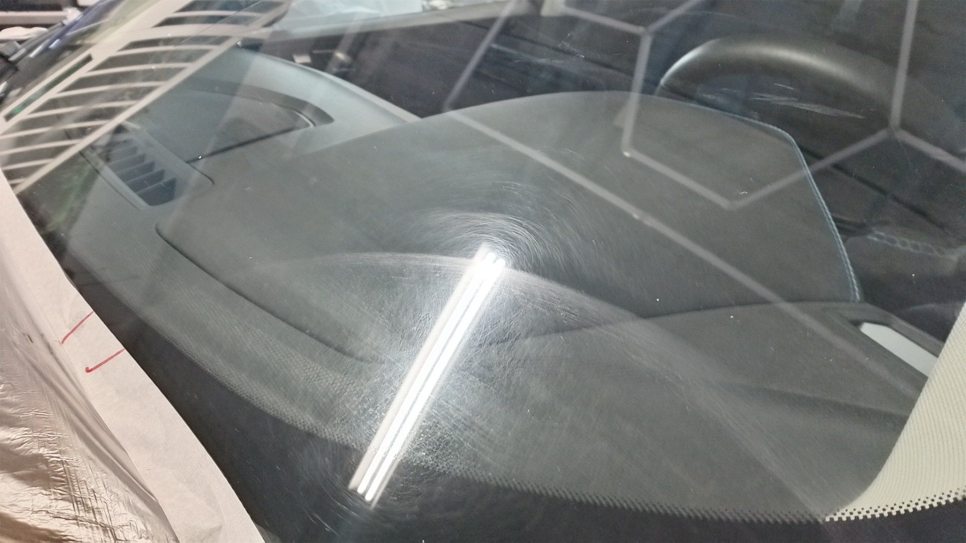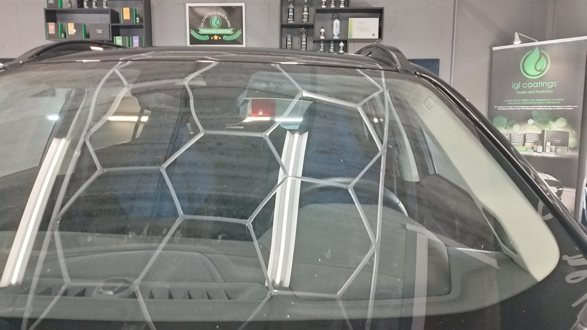 Meerdere zware krassen door het ruitenwisser blad veroorzaakt. Deze verwijderen met een doel om 90% te kunnen halen. Alleen nog rand schade, die niet in het zichtveld zit. Maar wel in de zwarte arceer randen zichtbaar zijn.
