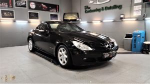 Deze zwarte SLK onderhanden nemen op verschillende onderdelen; interieur reinigen, ontgeuren en verzorgen. Exterieur poetsen, heel veel krassen weghalen en de koplampen schuren, polijsten en coaten. Einddoel weer een strakke frisruikende SLK neerzetten.