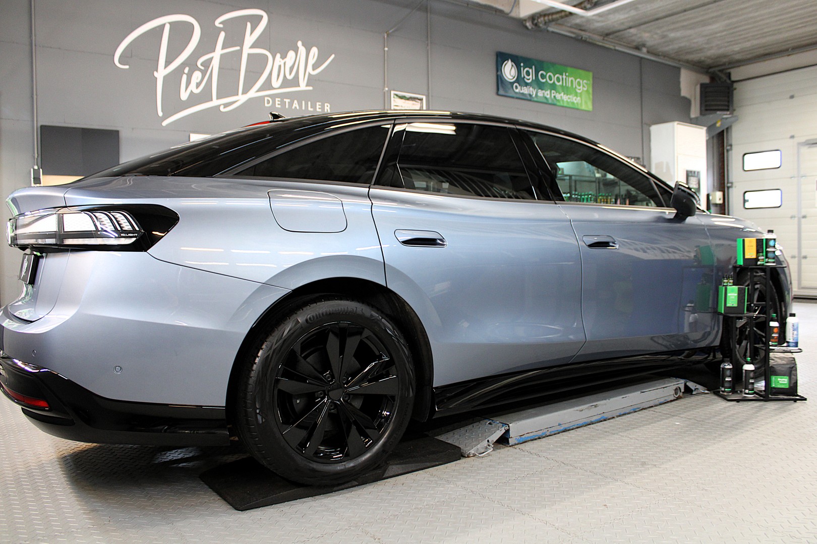 De lichtblauwe ID7 is een behandeling ondergaan in de vorm van reiniging en bescherming. Dit met keramische coating van IGL. Daarnaast zijn de ramen en glazen dak ook voorzien van keramische coating. Interieur netjes gemaakt, Velgen in de spraywax gezet. De banden verzorg met IGL Tyre voor een mooie zwarte zijdeglans